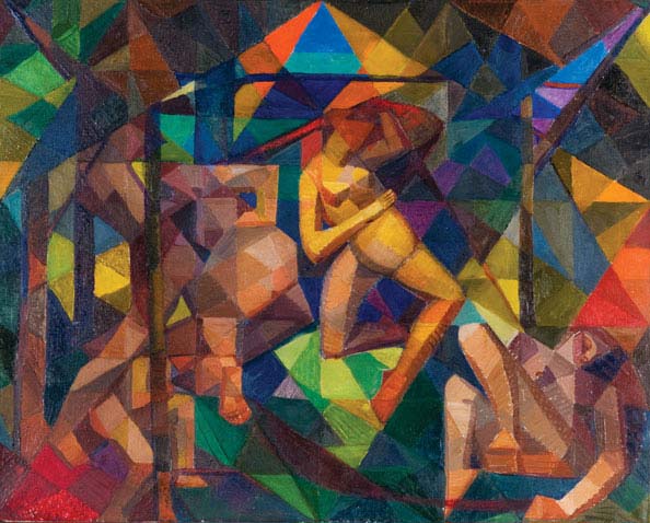 Munn took very traditional subject matter – landscapes, still life, the human figure – and transformed them through abstraction and bold experiments in colour. She was interested in reconciling new with old. In her untitled work, now known as "Nude in Forest", Munn explored containing the fragmented geometry of cubism within classical laws of proportion.