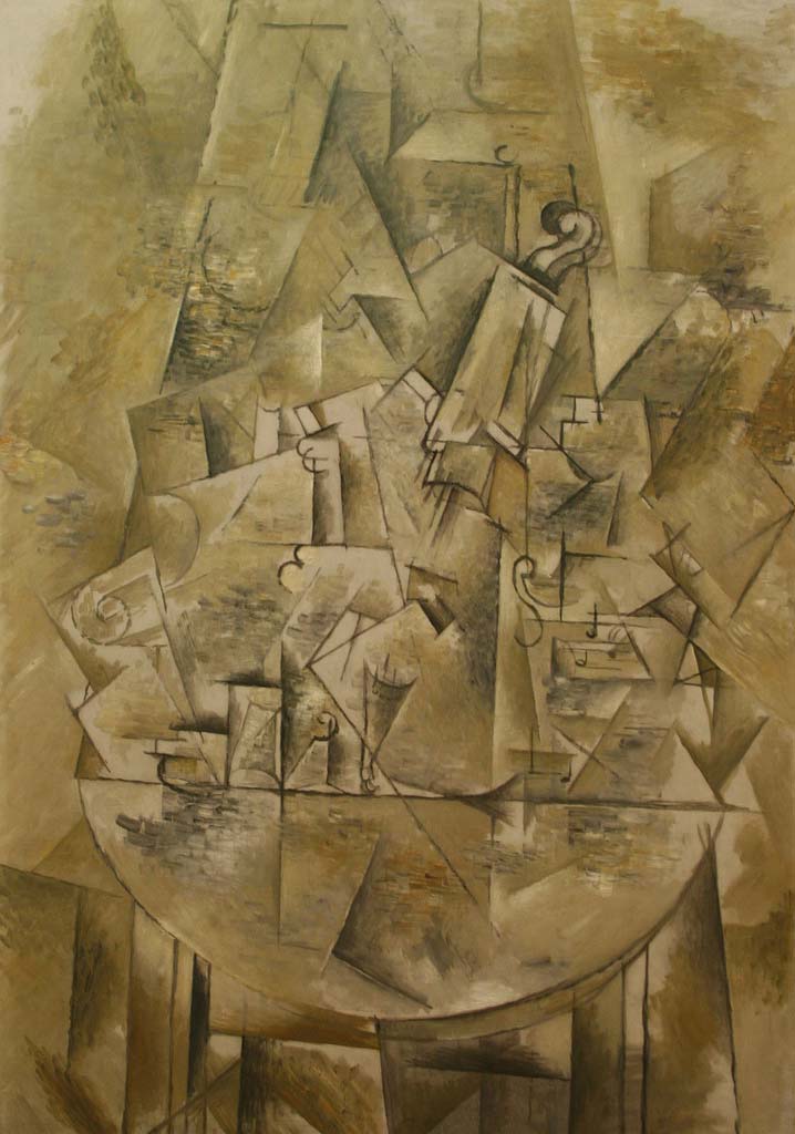 Later on in their explorations (now referred to as 'Synthetic' cubism) Braque and Picasso began to put the fragments of their subject back together again, and also began to collage elements from the outside world, such as newspaper, into their works.